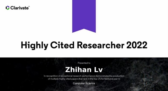 On November 15, Clarivate™ has announced the list of "Highly Cited Researchers 2022" in the world. Prof. Zhihan Lv, one of the outstanding editors of Metaverse, is on the list! In 2022, a total of 6,938 Highly-Cited Researchers are selected from 69 countries and regions of 22 fields including natural science and social science. Among scientists all over the world, the Highly Cited Researchers account for 1‰. The highly cited papers rank in the top 1% in WOS according to one or more fields in the publication year, which means that scholars have world-class influence in their research fields, and the scientific achievements have made outstanding contributions to the development in this field.