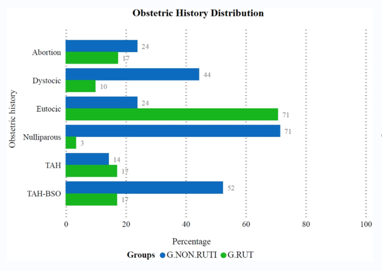 Figure 1. Percentages of distribution of obstetric history and conditions in women with urinary tract infections (G.RUTI) and without urinary tract infections (G.NON.RUTI). |